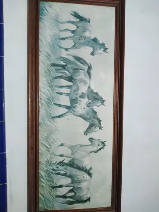 Precioso cuadro antiguo con una escena de caballos en movimiento. Ideal para decorar cualquier espacio. - Representación artística de caballos. - Marco de madera.