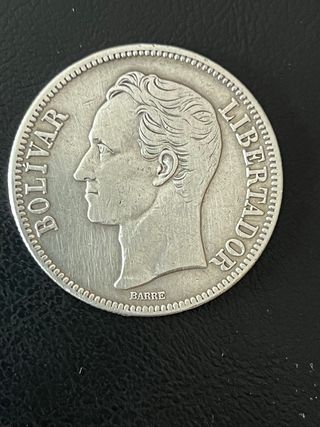Moneda de 5 Bolívares de Venezuela de plata. - Diseño detallado del Libertador. - Inscripción BOLÍVAR LIBERTADOR en el Anverso - Firma BARRE en la parte inferior. -Simón Bolivar