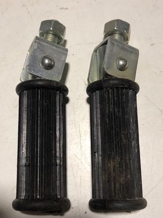 Par de reposapiés antiguos para motos. - Fabricados en goma y metal. - Incluye tornillería y tuercas de sujeción. - Procedencia de antiguo taller mecanico.