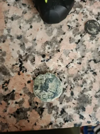 Moneda antigua de origen romano, con detalles grabados. - Material: Bronce - Color: Verde pátina