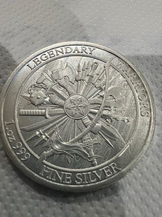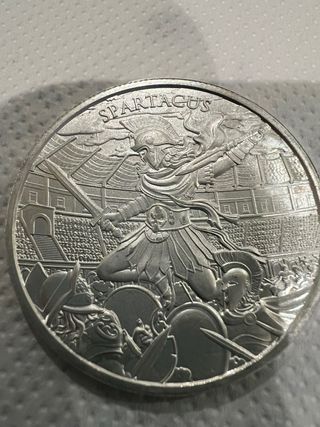 Onza de plata de la colección Legendary Warriors, con la figura de Espartaco. - Diseño detallado de Espartaco en combate. - Representación de una arena de gladiadores. - Plata de 999/1000