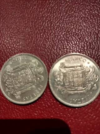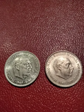 Se venden dos monedas de 5 pesetas de Franco, ambas con fecha de 1949, una estrella 49 y otra del 50. - Diseño de Francisco Franco Caudillo de España. - Grabado Por la G. de Dios.