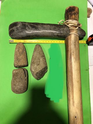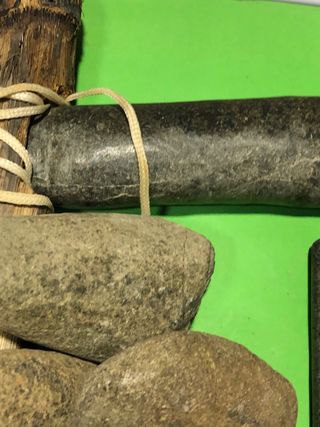 Conjunto de hachas de piedra de aspecto antiguo, elaboradas con materiales naturales. - Hacha principal con mango de madera y atadura de cuerda. - - Incluye tres trozos de hachas originales