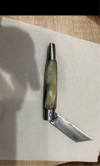 Navaja artesanal de Jerez, modelo Pelaez. - Empuñadura elaborada con asta de toro. - Hoja de metal.