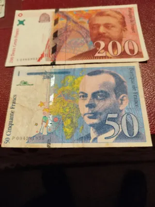 Conjunto de dos billetes de curso legal en Francia. - Un billete de 200 Francos, año 1996. - Un billete de 50 Francos, de 1992.