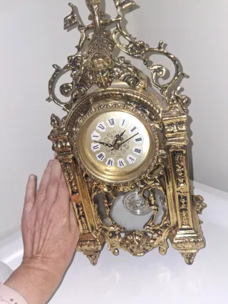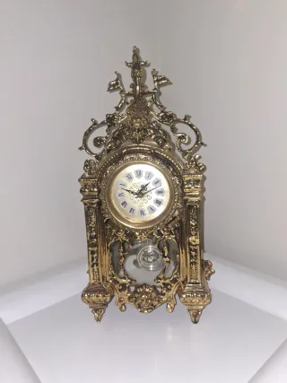 Elegante reloj de sobremesa con un intrincado diseño en bronce. Su estilo clásico lo convierte en una pieza decorativa. - Material: Bronce - Diseño ornamentado