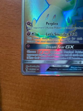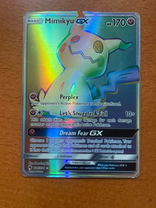Carta Pokémon Mimikyu GX, edición especial Rainbow Rare. 226/214 No está certificada como se ve en la imagen, tiene un pequeño rasguño en la cara (3 imagen) y esta en inglés SE ACEPTAN OFERTAS - Ataque Perplex: Confunde al Pokémon Activo del oponente. - Ataque Let's Snuggle & Fall: Inflige daño adicional basado en contadores de daño. - Habilidad Dream Fear GX: Permite barajar un Pokémon de Banca del oponente en su mazo. - HP: 170.