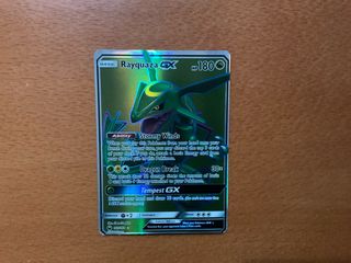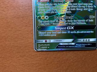 Carta Pokémon de Rayquaza GX 160/168 Esquinas un poco desgastadas SE ACEPTAN OFERTAS - Habilidad: Tormenta de Viento. - Ataque: Dragón Roto (30x). - Ataque GX: Tempestad GX. - Debilidad: x2. - Resistencia: Ninguna. - Coste de Retirada: 3.
