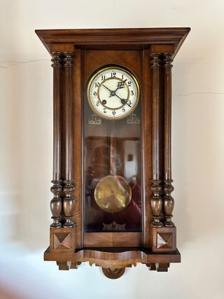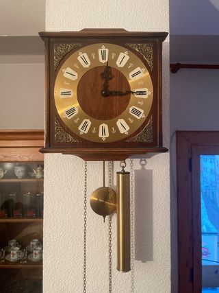 Reloj de pared clásico con péndulo y pesas. - Caja de madera. - Esfera dorada con números romanos. - Diseño tradicional. - Incluye péndulo y cadenas para las pesas.