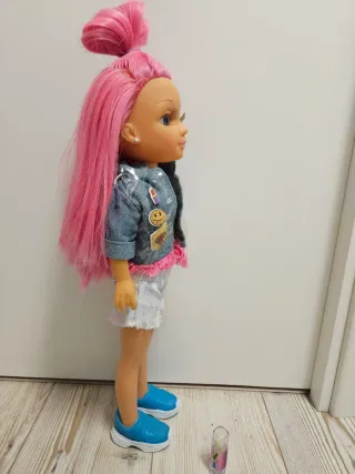 Muñeca Nancy con pelo rosa y conjunto de moda. - Chaqueta vaquera con parches. - Top corto estampado. - Shorts blancos con flecos. - Zapatillas deportivas azules. En perfecto estado.