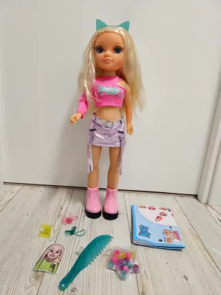 Muñeca Nancy con su conjunto de moda y accesorios. - Incluye diadema de orejas. - Falda brillante y top. - Botas rosas. - Peine y accesorios para el pelo. - Pegatinas. - Libro de instrucciones. El pelo se ilumina de diferentes colores, pareciendo que tenga el pelo de color.