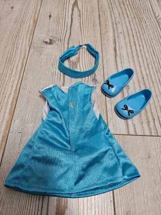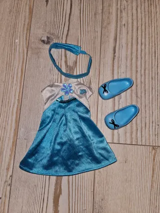 Conjunto de ropa para Nancy que incluye vestido, zapatos y diadema. - Vestido azul brillante con detalles plateados y flor. - Zapatos planos azules con lazo negro. - Diadema azul a juego.