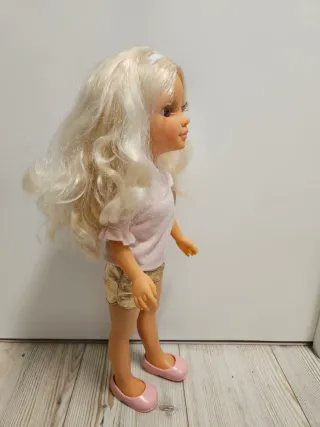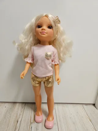 Muñeca Nancy con pelo rubio y un conjunto de ropa. - Camiseta rosa con detalle de bolsillo. - Pantalón corto dorado. - Zapatos rosas. - Adorno para el pelo en forma de lazo.