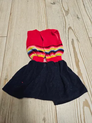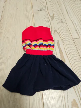 Vestido para Nancy de los años 80. Presenta un diseño colorido y divertido. - Parte superior roja con rayas multicolores. - Falda azul marino. - Cintura elástica.