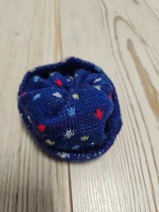 Gorro de lana azul con estampado de pequeños motivos de colores, ideal para muñecas Nancy de los años 80. - Diseño de punto. - Estampado multicolor.