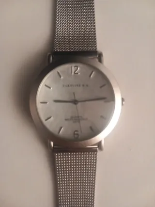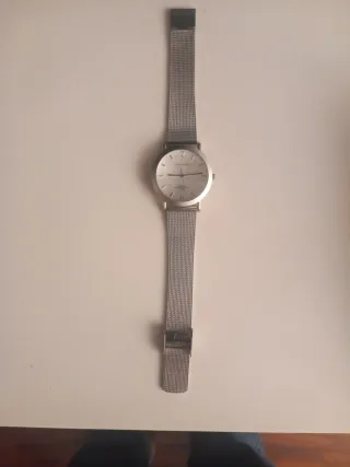 Elegante reloj de pulsera con correa de malla plateada. - Esfera redonda plateada. - Correa de malla metálica. - Cierre ajustable.