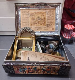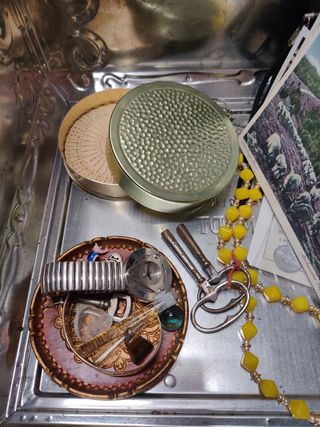 Antigüedades españolas, francesas, alemanas, en una caja de latón antigua de origen alemán. Postales escritas del siglo pasado y de diferentes temáticas como los juegos Olímpicos de Berlin de 1936. Marcos, pesetas de colección del 1975, posavasos, hojas de costura y bordados, joyería, llaves antiguas, figuras, radio(no funciona)... Se vende todo junto Adicionalmente puedo añadir por 5€ un diccionario de alimentos de los años 70. Si buscas o coleccionas antigüedades/ objetos vintage, pregúntame, también me muevo en el mercado alemán y francés y seguro que encontramos lo que buscas👍