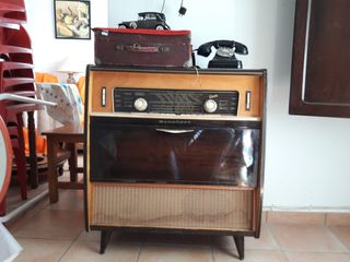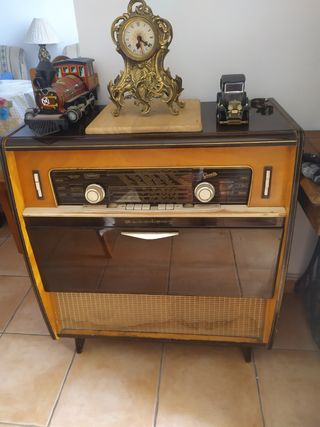 Mueble de música antiguo para tocadiscos, vinilos, radio,tiene altavoces ha ambos lados incorporados en la parte inferior. Se desliza para abrirlo, tiene desgaste en la parte superior por los años, aproximadamente del año 1930. No aseguro su correcto funcionamiento porque lleva más de 10 años sin usarse , lo que sí hay que poner el aguja de los vinilos , pero es toda una adquisición!!!!, el mueble se encuentra en Madrid Dimensiones: anchura 110 centímetros, profundidad 45 centímetros y altura 80 centímetros.