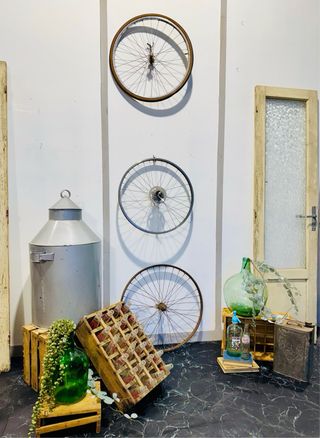 El precio es por las tres ruedas antiguas de bicicleta. Disponemos de infinidad de articulos antiguos originales para decoracion de eventos y hosteleria. Consultanos si necesitas una deco especial. caja, antigua, antiguo, antigüedades, vintage, radio, radios, transistor, molino, molinillo, cafe, piezas, pieza, barro, ceramica, puchero, botijo, deposito, metal, metalico, hosteleria, mobiliario, interiorismo, interiorista, estudio, boda, catering, cafeteria, local, meson, bici, damajuana, damajuanas, floreros, botellas, sifon, libros, reparto, madera, sifones, lampara, techo, puertas, grandes, antiguas, espejo