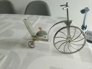 Original calentador de brandy o coñac con diseño de bicicleta antigua, de los años 60. Se trata de un artículo de colección diseñado para calentar suavemente la bebida antes de consumirla, realzando su aroma y sabor. Las tres ruedas se mueven, aunque como se puede ver en la última foto una de las ruedas tiene una raja. Ideal para coleccionistas o como pieza decorativa. - Fabricado en metal plateado. - Rueda delantera grande con radios. - La copa de brandy no está incluida. - Depósito para líquido y mecha.