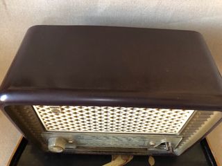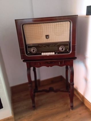 Radio antigua Philips en buen estado. Funciona pero sólo sintoniza una emisora. Es una pieza elegante y clásica, ideal para coleccionistas o amantes del diseño retro. - Radio de fabricación antigua. - Color marrón oscuro. - Diseño clásico y elegante.