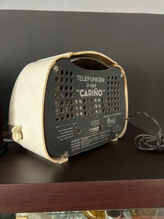 Radio antigua de 1954 modelo “Cariño” de la marca Telefunken. Un diseño clásico y elegante. No sé si funciona. Tiene desperfectos en la pintura pero la baquelita no está rota. Mide 24x18x14