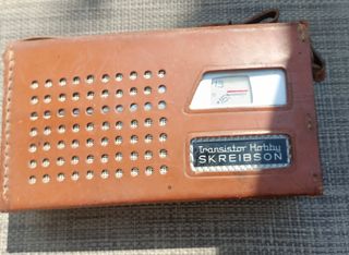 Radio antigua de transistores Skreibson Hobby. Se encuentra en buen estado, aunque muestra señales de uso. No funciona - Radio portátil de la marca Skreibson. - Modelo Hobby. - Carcasa de cuero marrón.