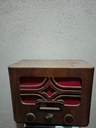 Radio antigua con carcasa de madera. - Diseño clásico. - Frontal con rejilla decorativa y detalles en rojo. - Dos mandos frontales y un interruptor.
