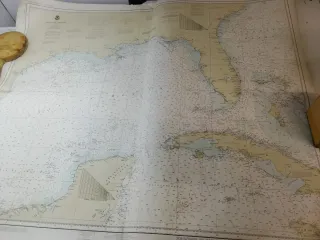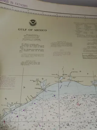 Mapa náutico antiguo del Golfo de México, publicado por la NOAA. LORAN (Long Range Navigation) fue un sistema de radionavegación hiperbólica de medio alcance que permitía a los navegantes determinar su posición midiendo la diferencia de tiempo de recepción de señales de radio de baja frecuencia transmitidas por balizas terrestres fijas. - Escala 1:400,000. - Proyección Mercator. - Sondeos en brazas (fathoms) a nivel medio de bajamar. - Diseñado para navegación en alta mar. Medidas aprox 115x75cm