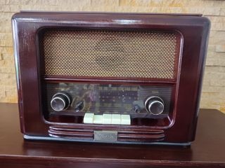 Preciosa radio de los años 50, en perfecto estado de conservación. Es una pieza elegante y nostálgica, ideal para coleccionistas o amantes del diseño vintage. - Radio de madera y baquelita crema. - Diseño clásico y compacto. - Escala de frecuencias en la parte frontal.