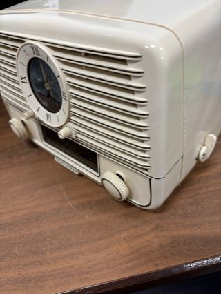 Preciosa radio TELE-TONE 165, una radio fabricada en estados unidos en 1948 Se encuentra en excelentes condiciones estéticas de plastico moderno no, bakelita ni catalin,tiene unas medidas 216 x152x102 y una tension de alimentacion 125 V la radio funciona bien, OM-solamente en un estado estupendo para colecionistas, una radio que no sale frecuentemente para la venta, las fotos forman parte de la descripcion Haga preguntas si no está seguro. Estoy feliz de ayudar. Tenga la seguridad de que su compra será empaquetada de forma segura. - Radio antigua de válvulas. - Modelo Tele-Tone 165. - Carcasa de baquelita.