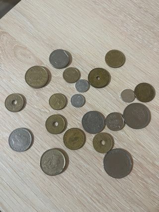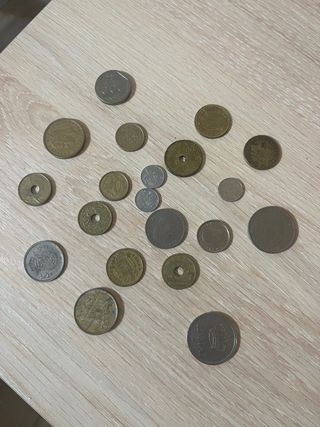 Conjunto de varias monedas antiguas de España, ideales para coleccionistas. - Diversos diseños y épocas. - Piezas de metal. - Cada moneda tiene un diámetro diferente.