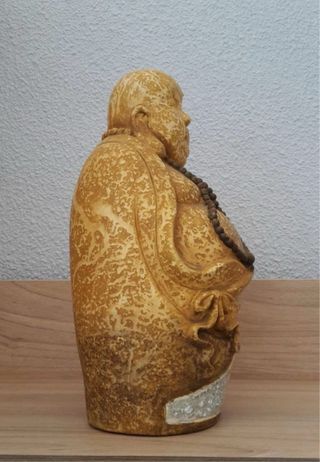 Figura decorativa de Buda sonriente, ideal para dar un toque de serenidad a tu hogar. - Acabado en tonos tierra y detalles plateados. - Lleva un collar de cuentas.