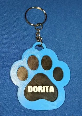 Llavero con forma de patita de perro o gato, personalizado con el nombre Dorita. Ideal para identificar a tu mascota. - Diseño de huella. - Color azul. - Nombre Dorita en blanco. Se puede hacer como placa identificativa para el collar.