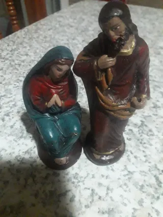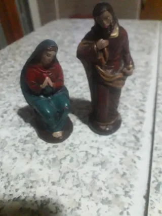 Conjunto de figuras para el Belén. - Figura de María con manto rojo y vestido azul. - Figura de José con túnica granate y detalles dorados.