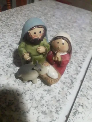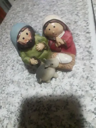 Figura de nacimiento hecha de resina. - Representación de la Sagrada Familia con animales.