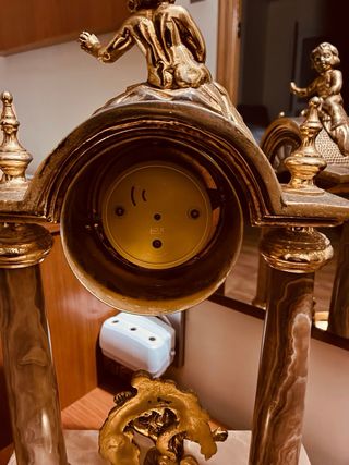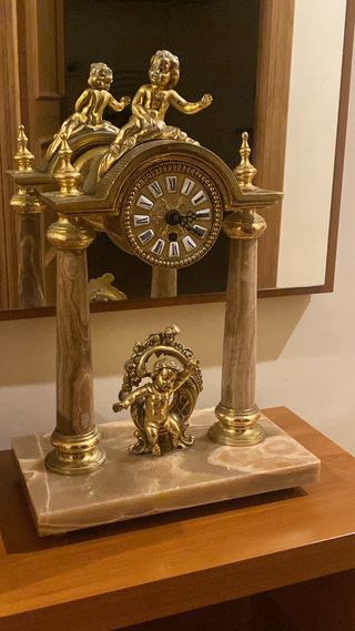 Elegante reloj de sobremesa con un diseño clásico y detalles ornamentales. - Figuras de querubines en bronce dorado. - Base de mármol y columnas de ónix. - Esfera con números romanos.TIENE MÁS DE 50 AÑOS.precio negociable.