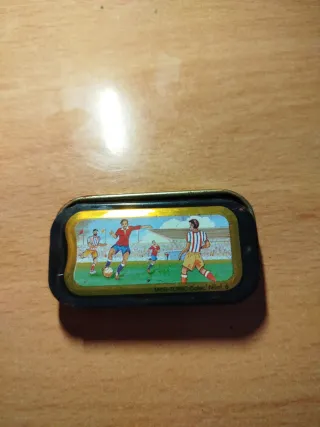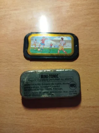 Cajita de pastillas de regaliz de colección de los años 70-80. - Diseño con escena de fútbol. - Texto: MINI-TONIC Colec. Núm. 6.
