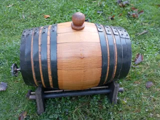 Barrica de madera de Roble para vermut con capacidad de 8 litros. -Ideal para uso doméstico -actualmente llena de Vermut, , se vende vacía -Recien revisada, limpia y sin fugas - Incluye grifo metálico -tapon de silicona - Soporte de madera de pino - barra de nivel -diametro de 19cm a 24cm -largo 33cm -altura total con soporte y tapón 32cm