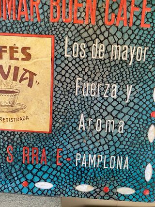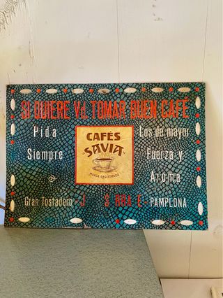 Cartel publicitario antiguo de Cafés SAVIA de Pamplona. Mide 33 x 24 cm con relieves de granos de café - Si quiere Vd. tomar buen café, pida siempre SAVIA.