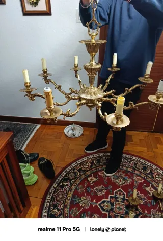 Elegante candelabro de bronce con un diseño clásico. - Material: Bronce - Estilo: Vintage - Acabado: Dorado