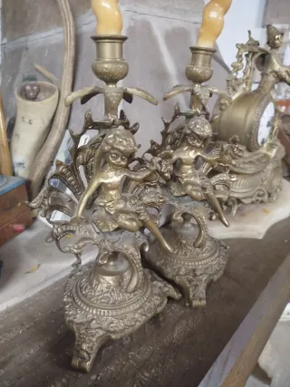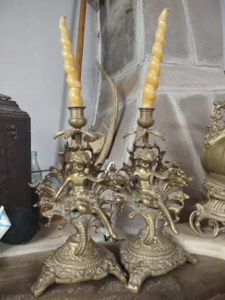 Elegante pareja de candelabros antiguos con figuras de querubines. - Cada candelabro tiene capacidad para una vela. - Base ornamentada con motivos clásicos.