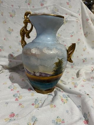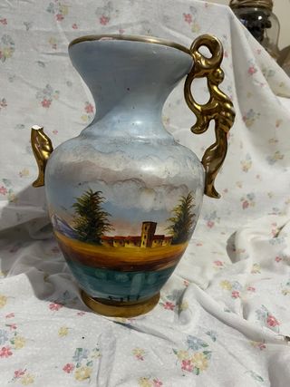 Elegante jarrón antiguo con un diseño pintado a mano que evoca un paisaje. Medidas: 28cm - Detalles dorados en las asas y el borde. - Pintura de paisaje con edificios y árboles. - Base y cuello en tonos claros y oscuros. Una asa rota, pero se puede pegar