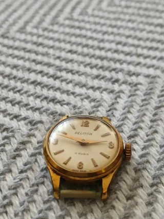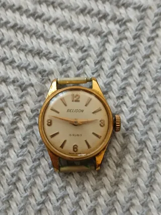 Reloj de pulsera de la marca Belison con movimiento de 15 rubíes. Made Swiss. No se ha probado funcionamiento. - Antiguo y muy pequeño. - Esfera de color crema. - Indicadores horarios dorados. - Caja y corona doradas. - Sin Correa.