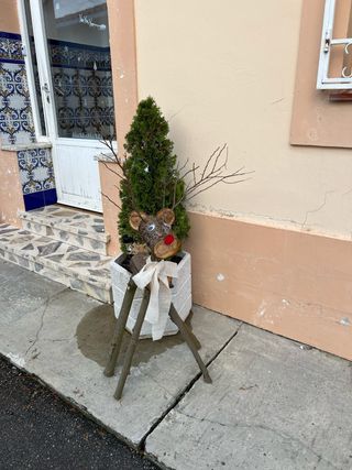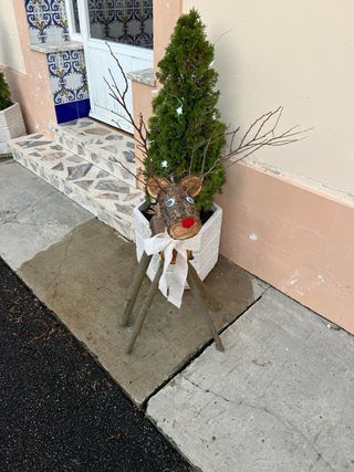 Figura decorativa de reno hecha de madera, perfecta para ambientar en época navideña. - Patas de ramas. - Nariz roja. - Lazos de tela blanca. - Se encuentra en Asturias, no hago envíos.