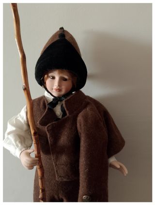 Muñeco artesanal con traje campurriano. Muñeco decorativo de estilo tradicional Hecho a mano Realizado con cabeza, manos y piernas de porcelana con rasgos delicados y expresión suave. Vestimenta completa de época en tonos marrones de lana: chaleco, pantalón, chaqueta corta, gorro escarpines, medias y camisa crema. Sombrero de lana bicolor y bastón de madera natural. Calza zuecos de madera y se presenta sobre base de madera para mantenerse de pie. - Traje marrón de lana. - Calzado con albarcas hechas a medida.