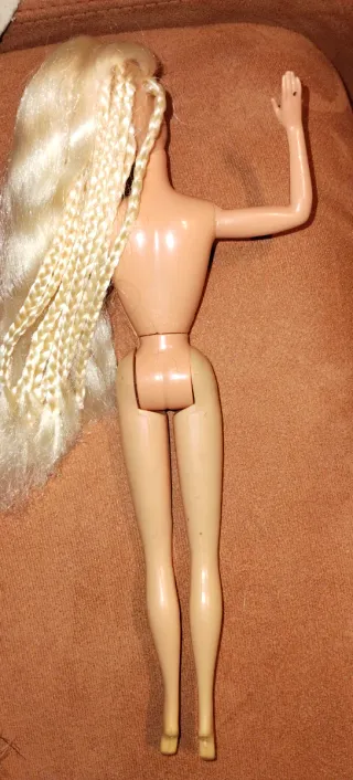 Muñeca Barbie de Congost, fabricada en España, está en muy buen estado, salvo que hace años se la empezó a borrar el maquillaje de la cara y de niña se lo retoqué. Está fabricada en España. No tiene mordeduras, ni roturas. Las articulaciones perfectas. Melena por debajo del culete, platino.