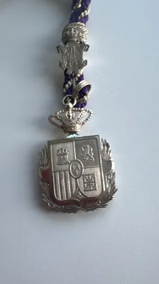 Insignia de Vigilancia Custos del Ayuntamiento de Irún. Pieza metálica con cordón morado y plateado. Medidas: 6,5/4/0,5 Siglo y pico de antigüedad. - Diseño con escudo. - Corona superior. - Adorno de laurel. Entrega en persona.
