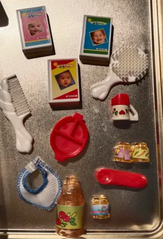 Set de accesorios para muñecas Barbie Shelly, ideal para recrear momentos de comida. - Incluye trona blanca con detalles de corazones y cerezas. - Accesorios plato, vaso, cubierto, babero, peine, cepillo. Papillas , 3 potitos y zumo. Está en perfecto estado. Set completo.
