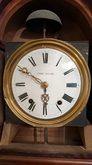 Antiguo reloj de pie de la marca Federico Alejandre, originario de Santander. Una pieza clásica y elegante para el hogar.Medidas: Altura de 2,07 metros y ancho máximo en la base de 46 cm. Madera: Madera noble de alta calidad (posiblemente caoba o castaño), con un veteado y tono rojizo oscuro muy bien conservado. El reloj está COMPLETO. Incluye sus pesas originales, péndulo de lira y la llave/manivela original (encontrada en el fondo del mueble). Entrego la aguja y la tuerca central de latón originales (actualmente tiene una tuerca provisional de ferretería). Recogida en Reinosa, 3°sin ascensor buen aparcamiento, escalera amplia